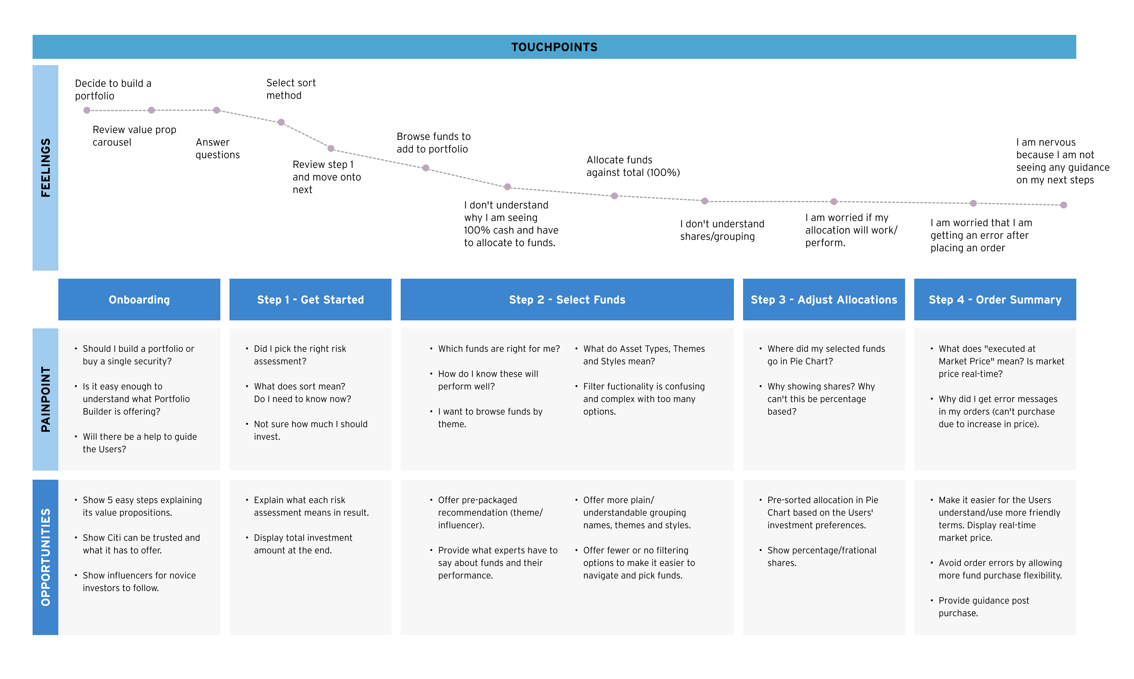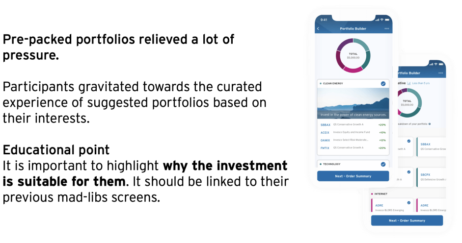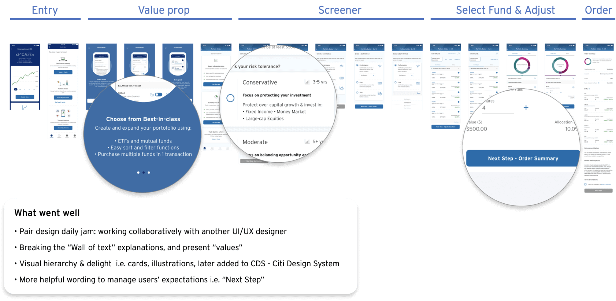 Novice investors face challenges in navigating the world of investing due to a lack of personalized guidance and experience. My role was to develop a future state portfolio builder for Citibank's investment platform, aimed at addressing their specific needs.