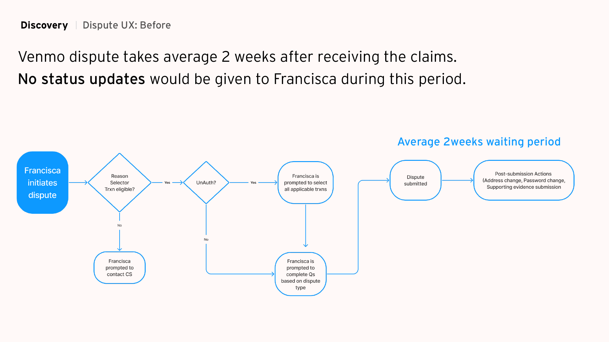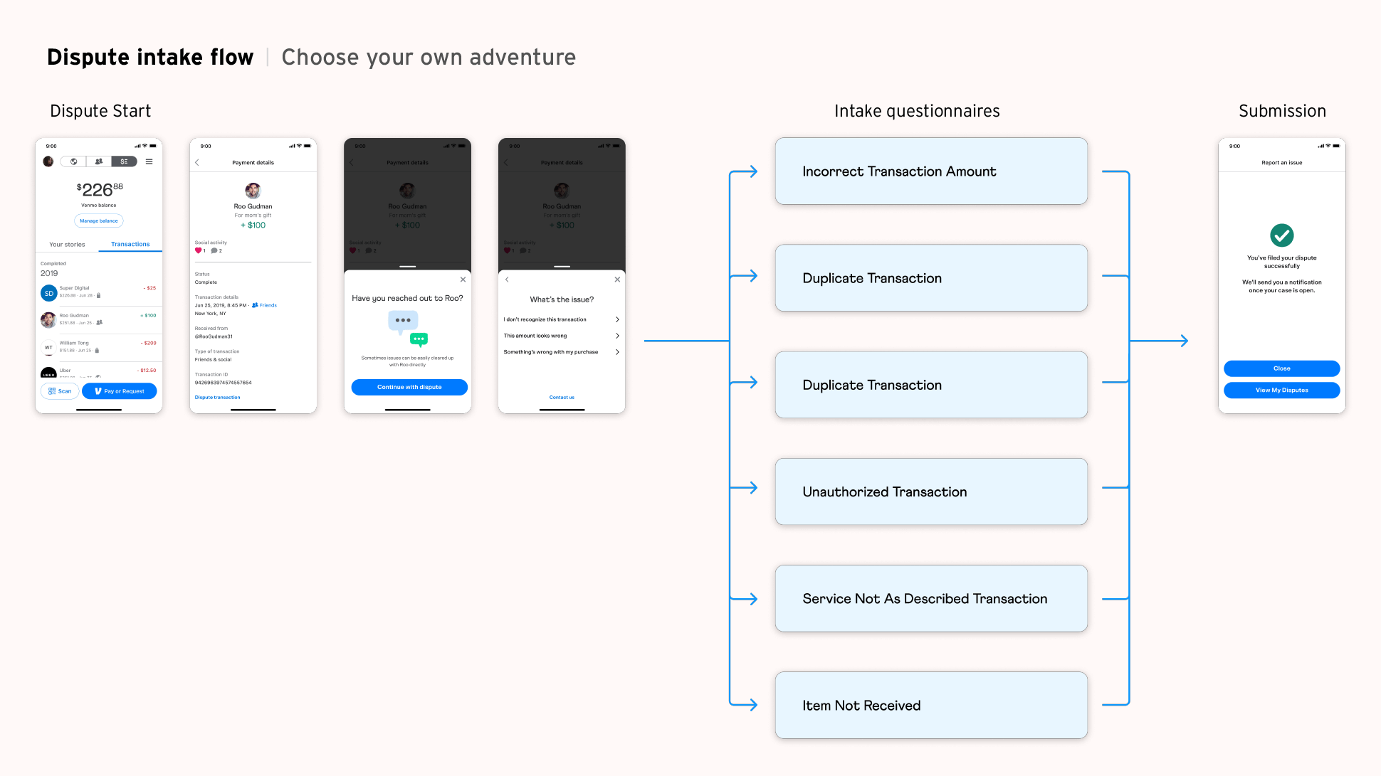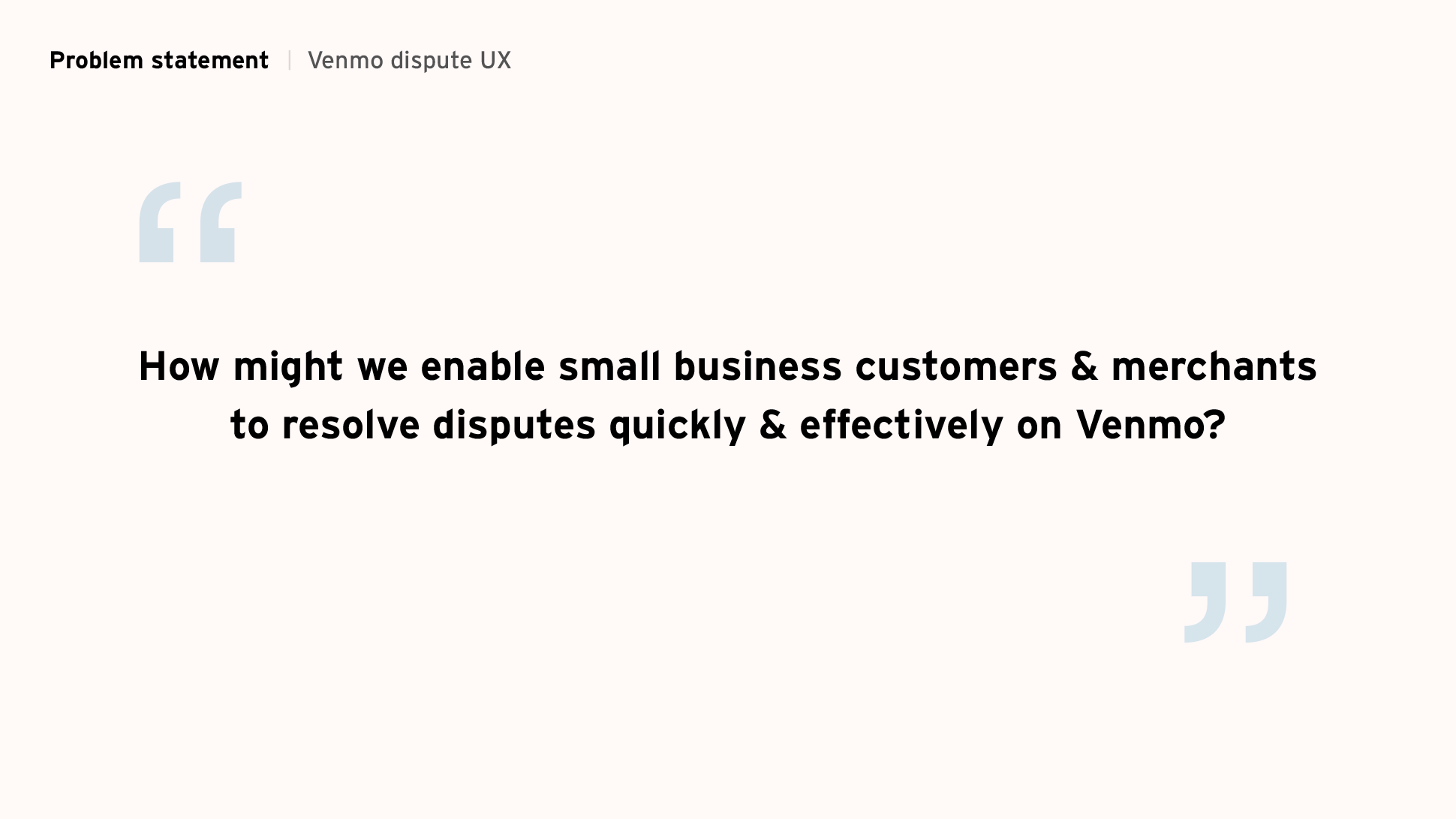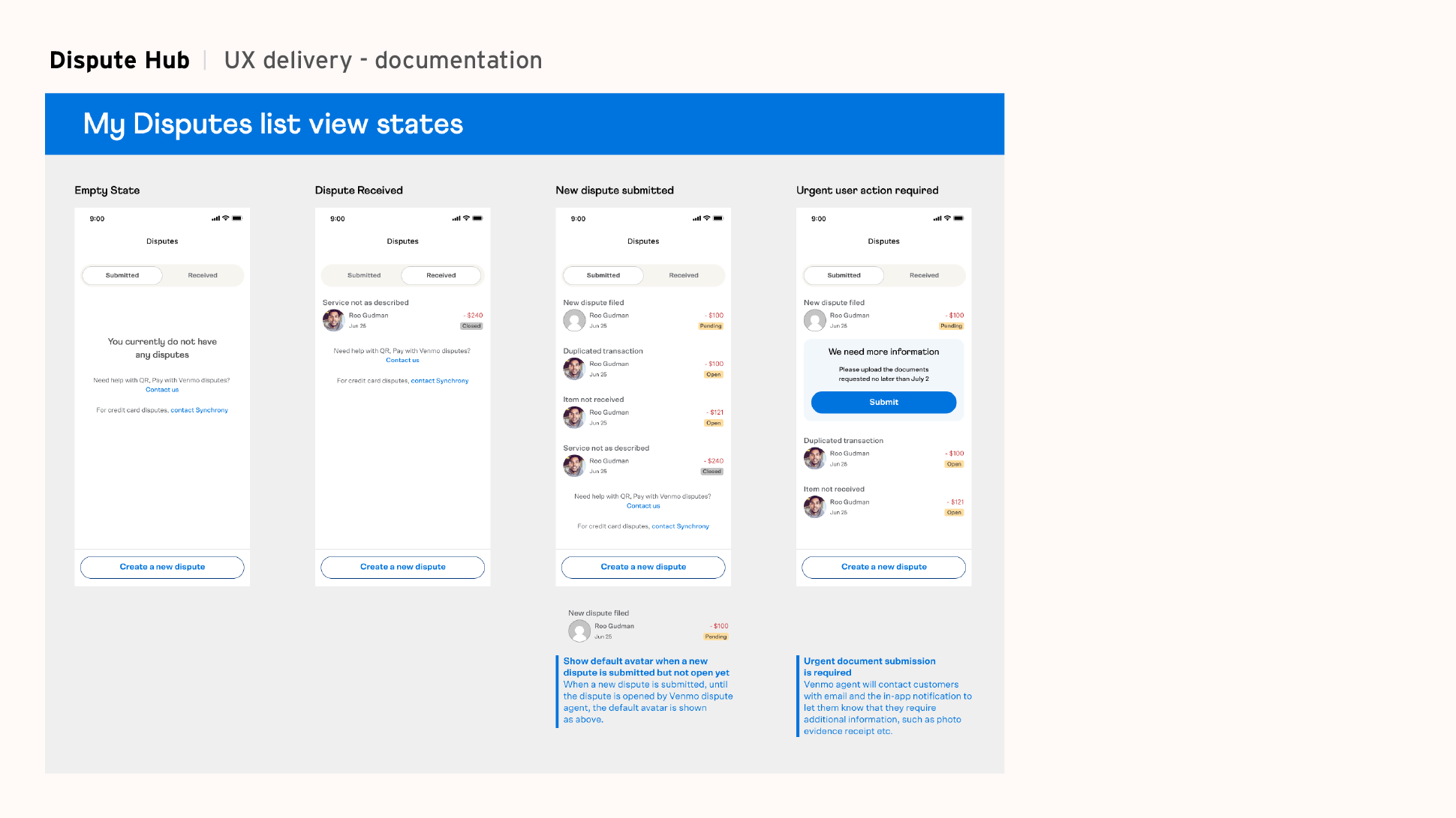 Venmo was managing small business disputes through agents via email & phone, but with increasing transaction volume, a more efficient solution was needed. I helped to introduce a new UX that leveraged a new dispute engine, reducing customer dispute calls by 40%.