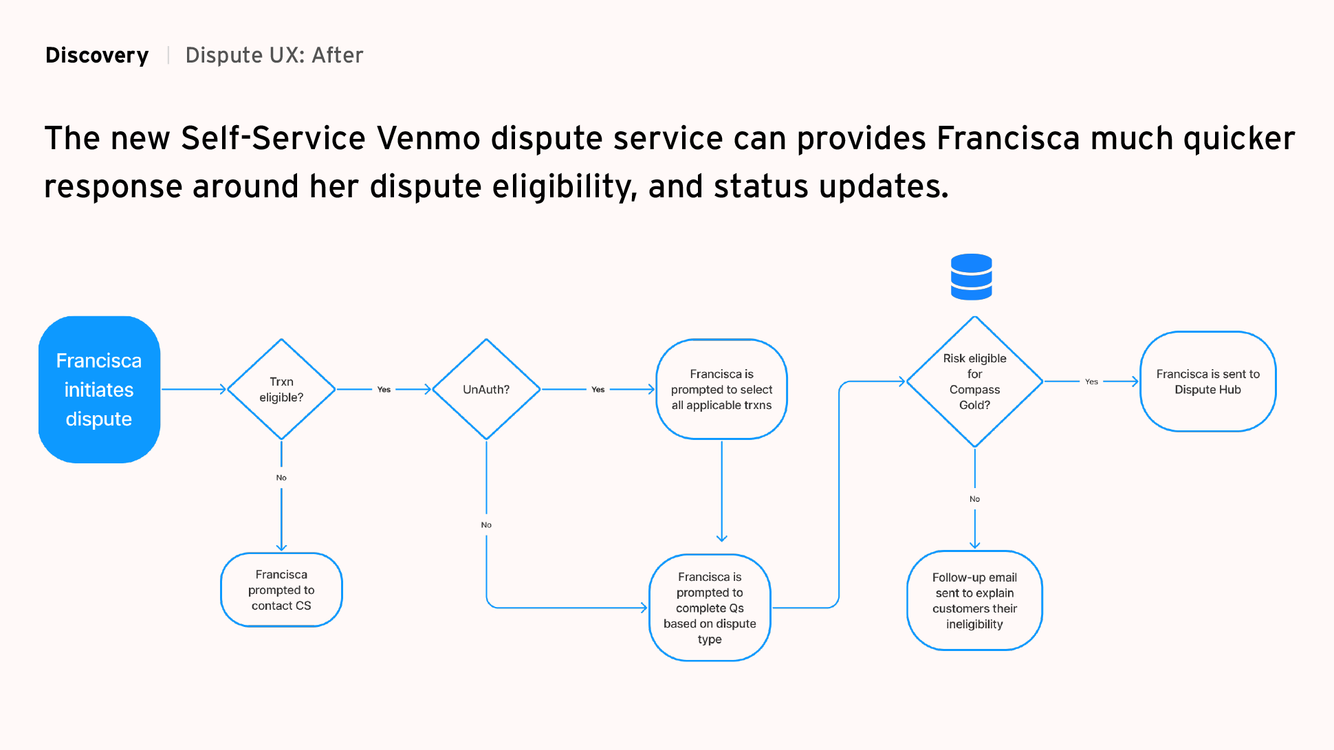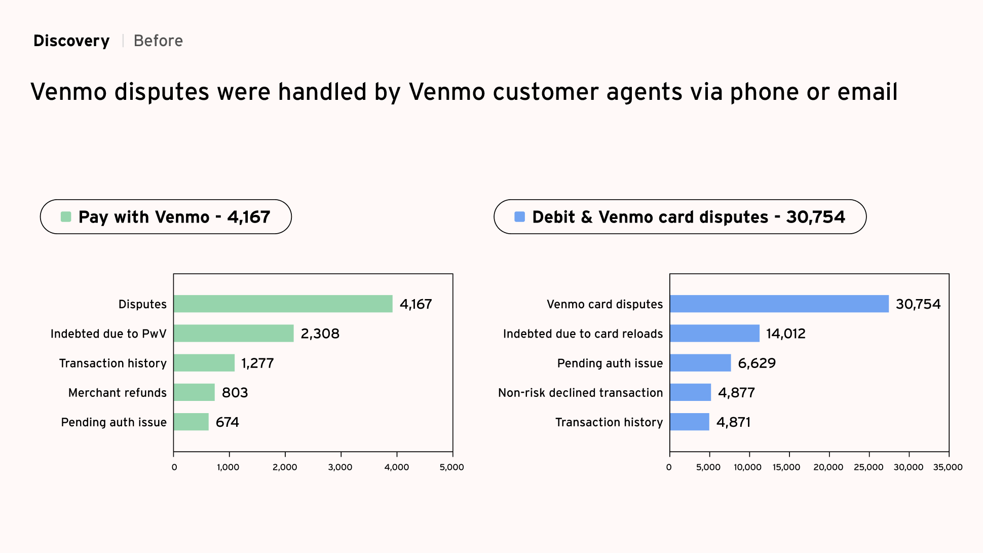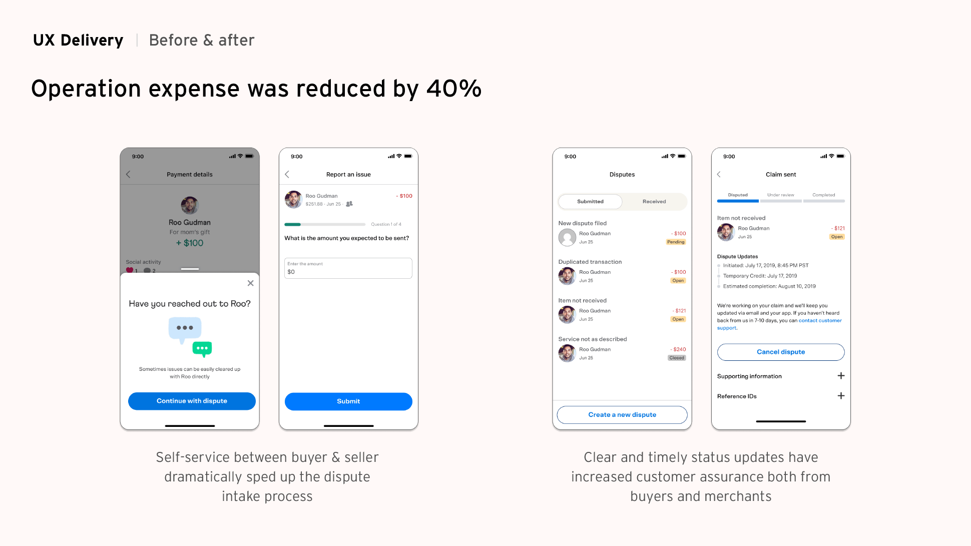 Venmo was managing small business disputes through agents via email & phone, but with increasing transaction volume, a more efficient solution was needed. I helped to introduce a new UX that leveraged a new dispute engine, reducing customer dispute calls by 40%.