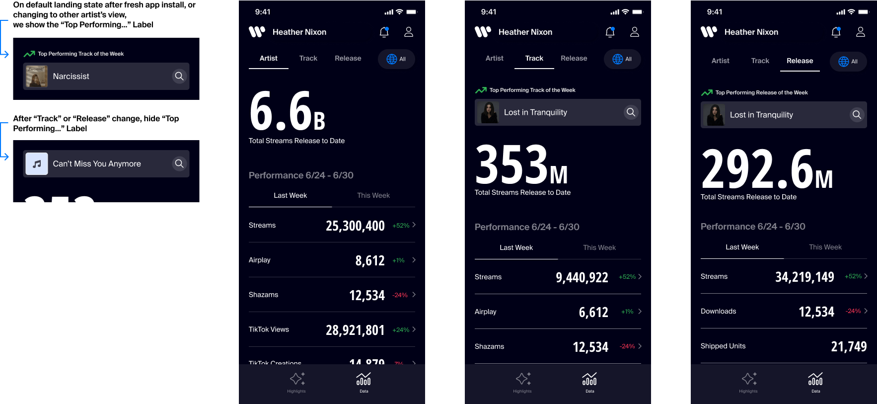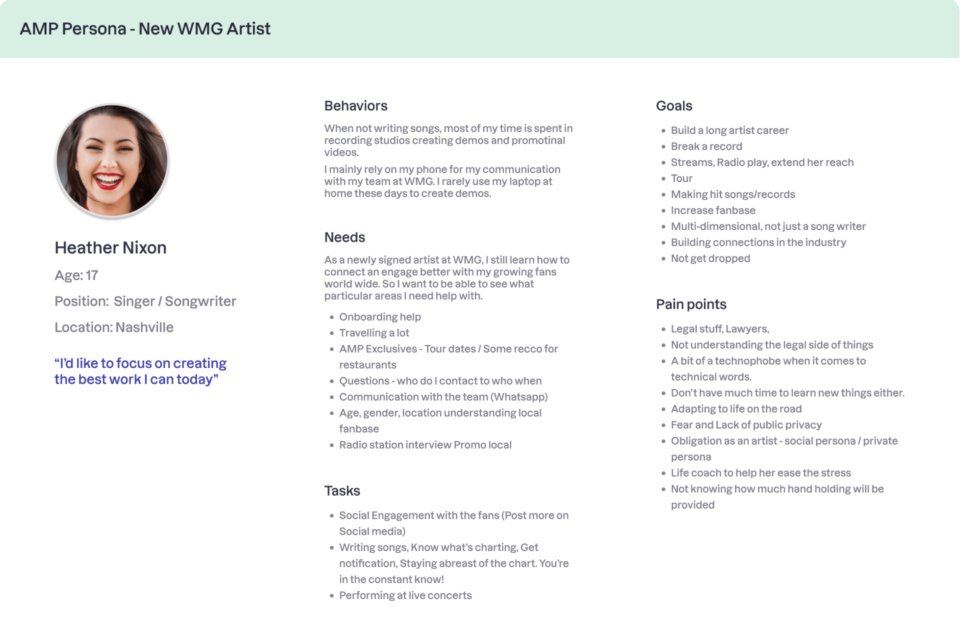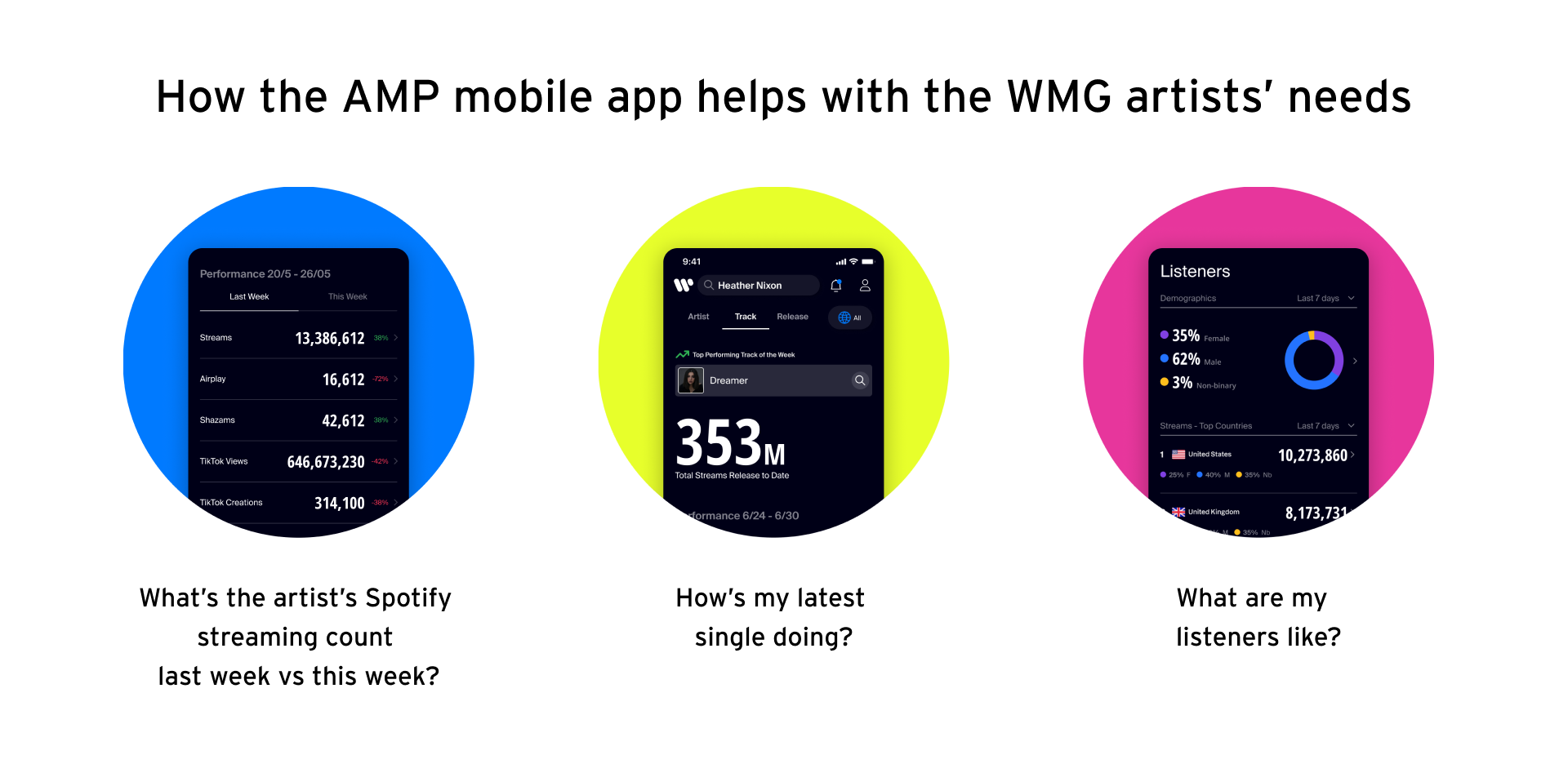 AMP helps WMG artists and managers understand performance. I shaped the UX to turn fragmented data into clear signals—supporting emerging artists at critical growth moments.