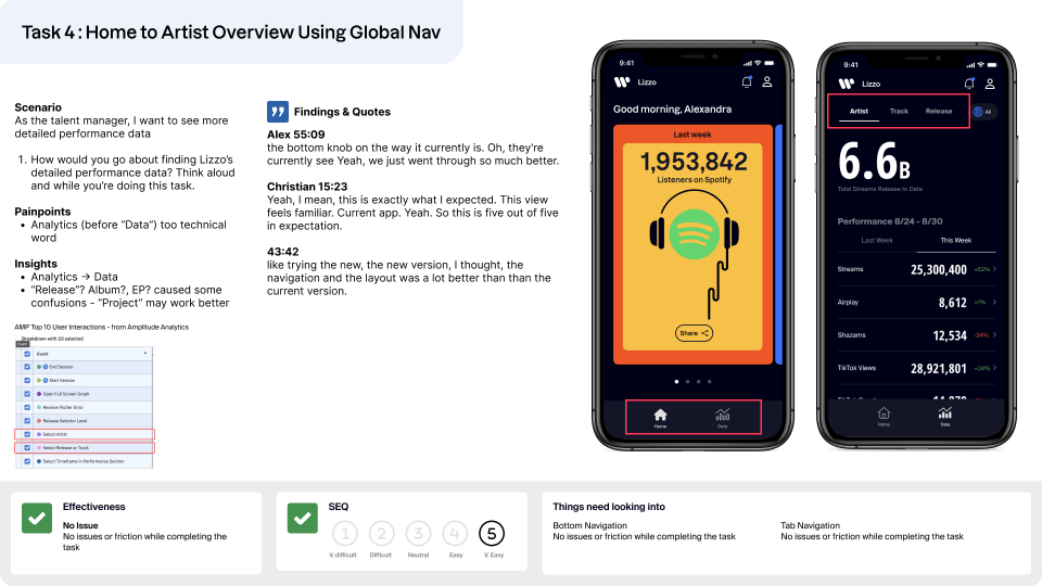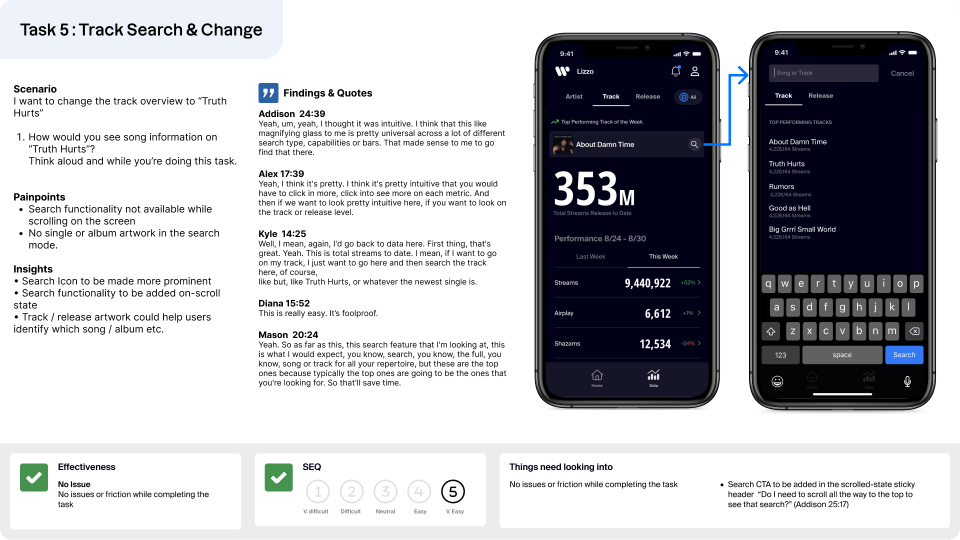 The data-centric screens with multiple filters and hidden navigation posed challenges for searching artist, track, or release data, impacting UX due to discoverability issues.