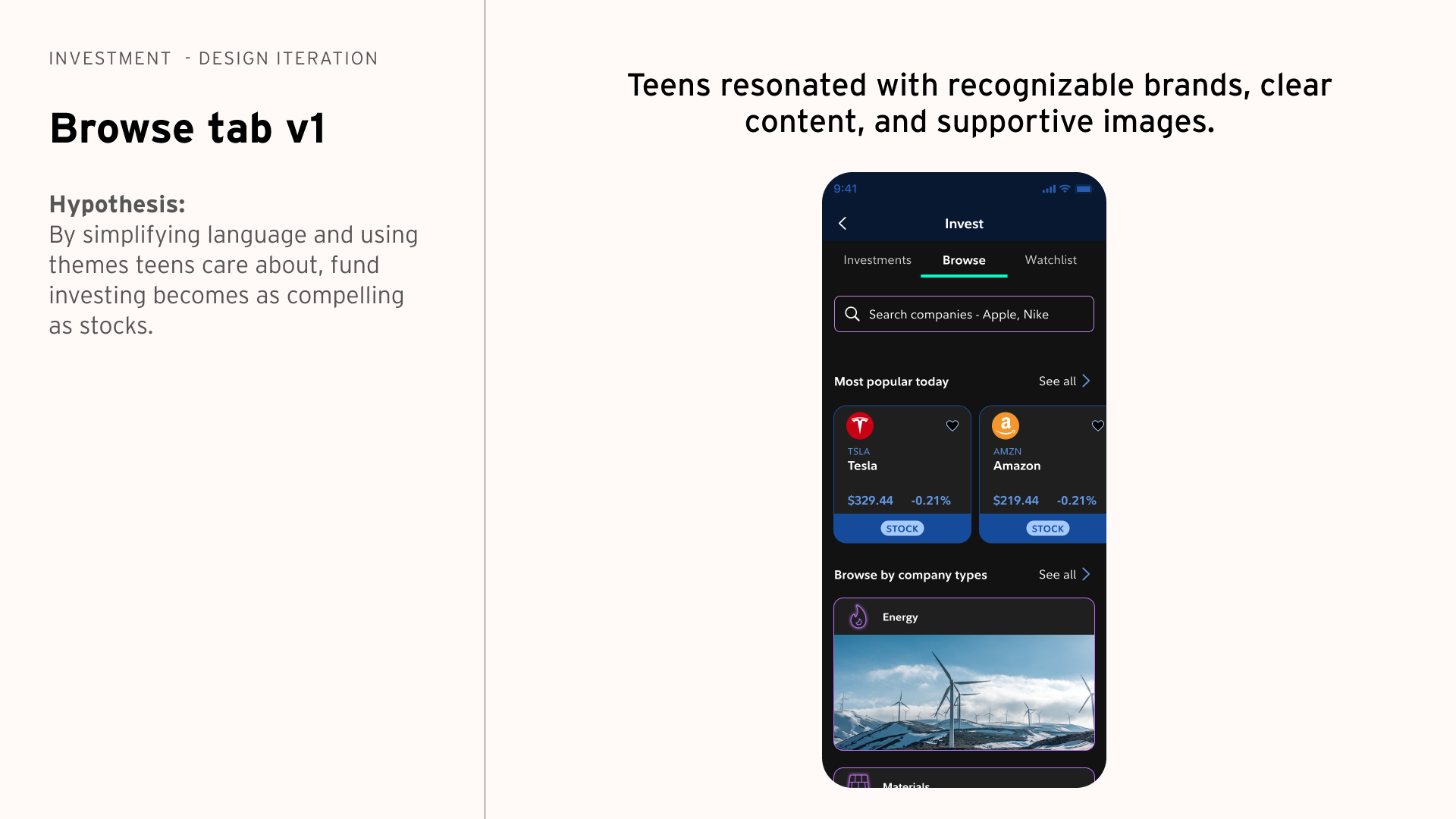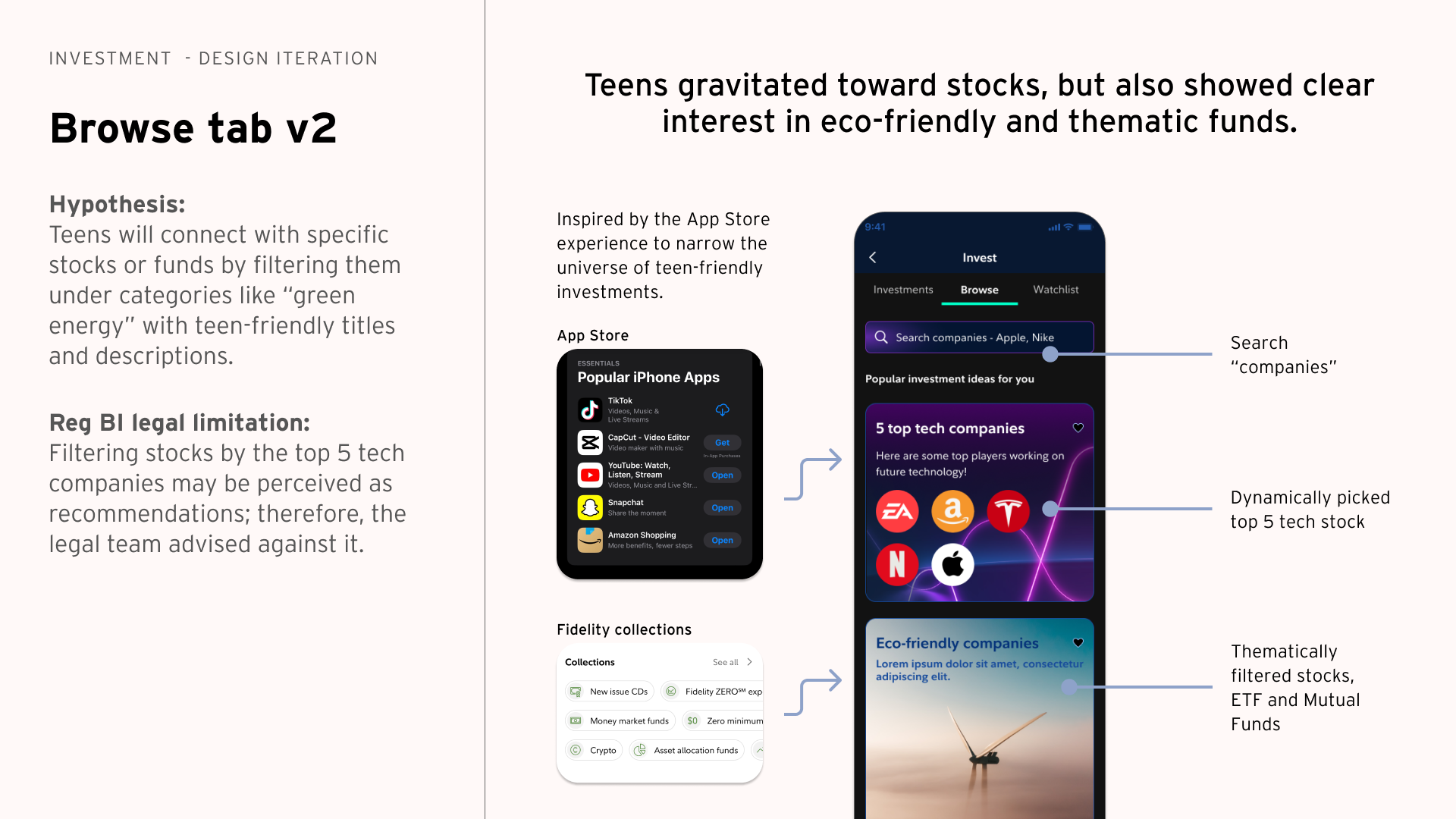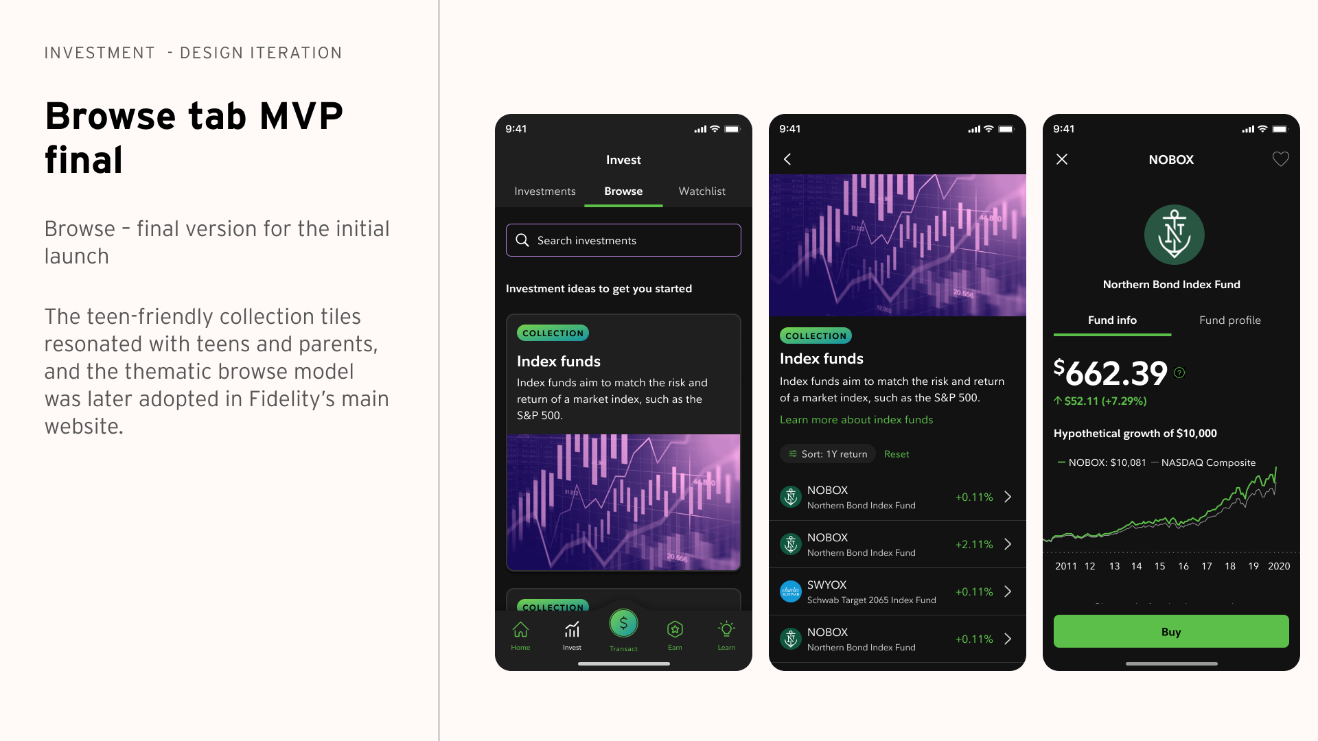 The final MVP used themed investment collections to help teens discover investments without financial jargon.